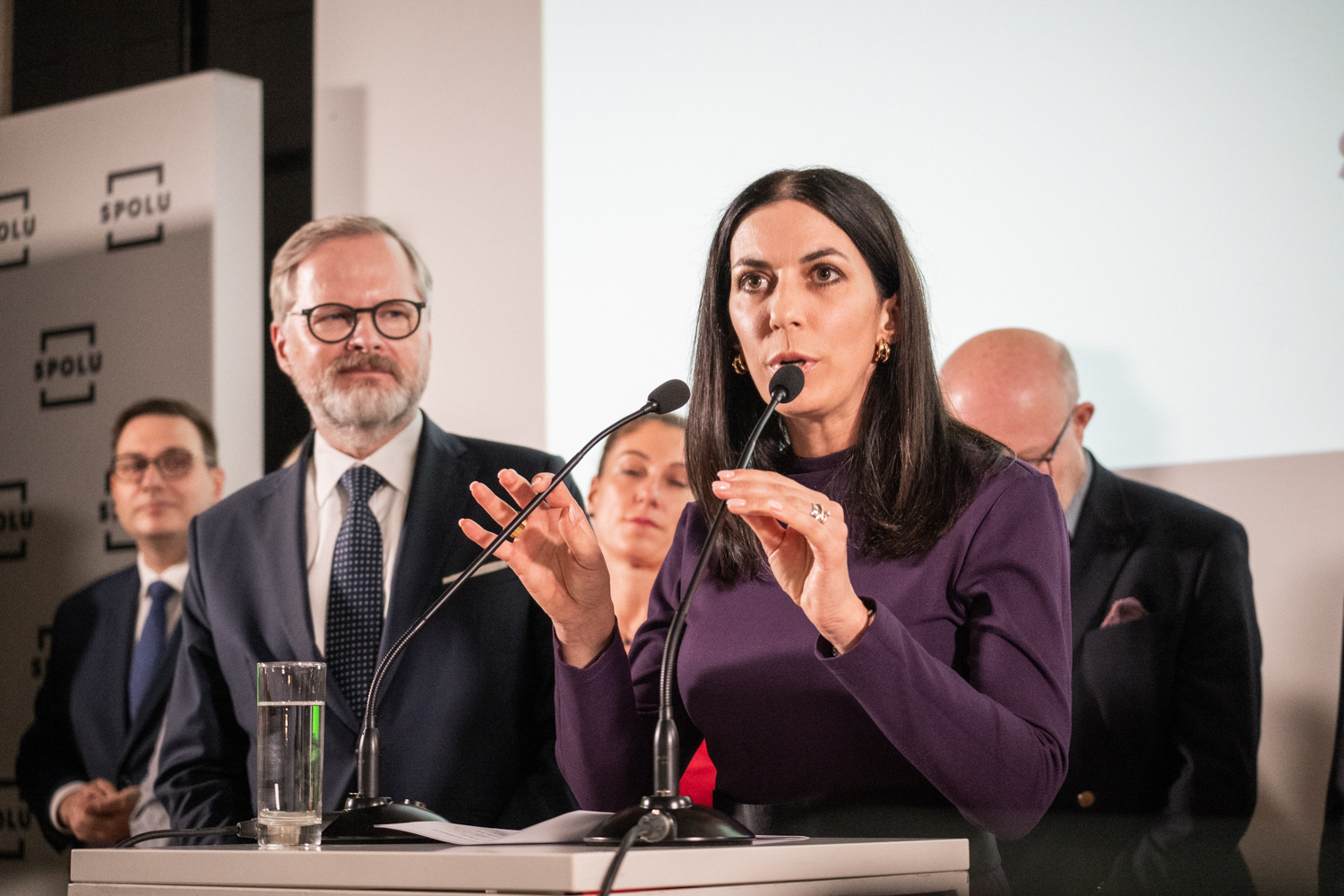 Galerie | FOTO: Lídři koalice Spolu se ve štábu jen mihli. Po tiskové konferenci odjeli