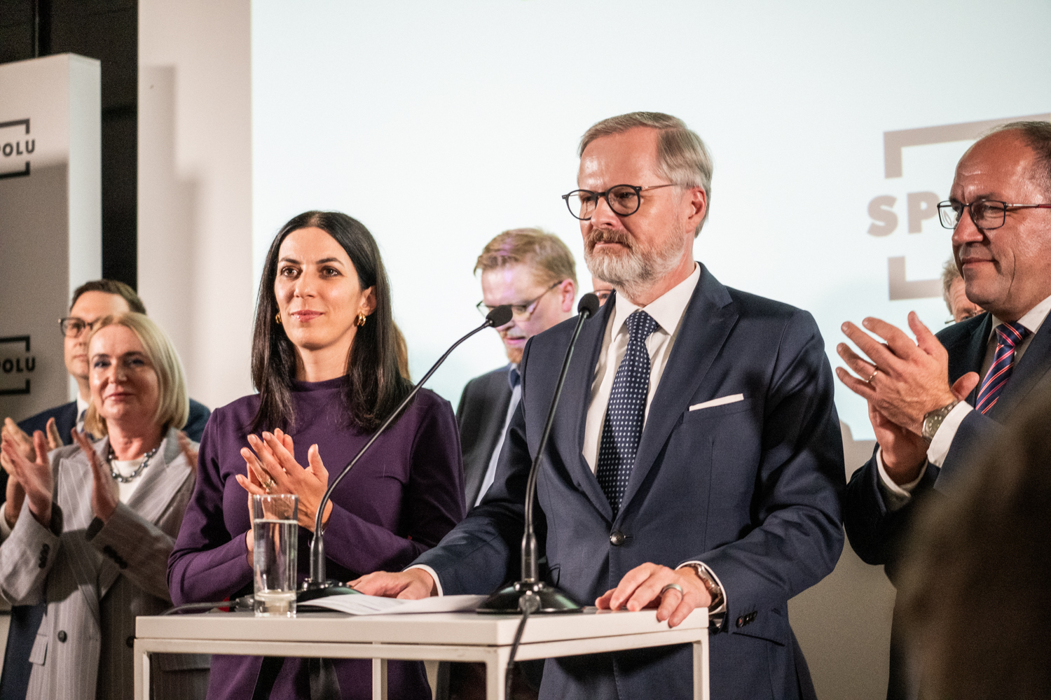 Galerie | FOTO: Lídři koalice Spolu se ve štábu jen mihli. Po tiskové konferenci odjeli