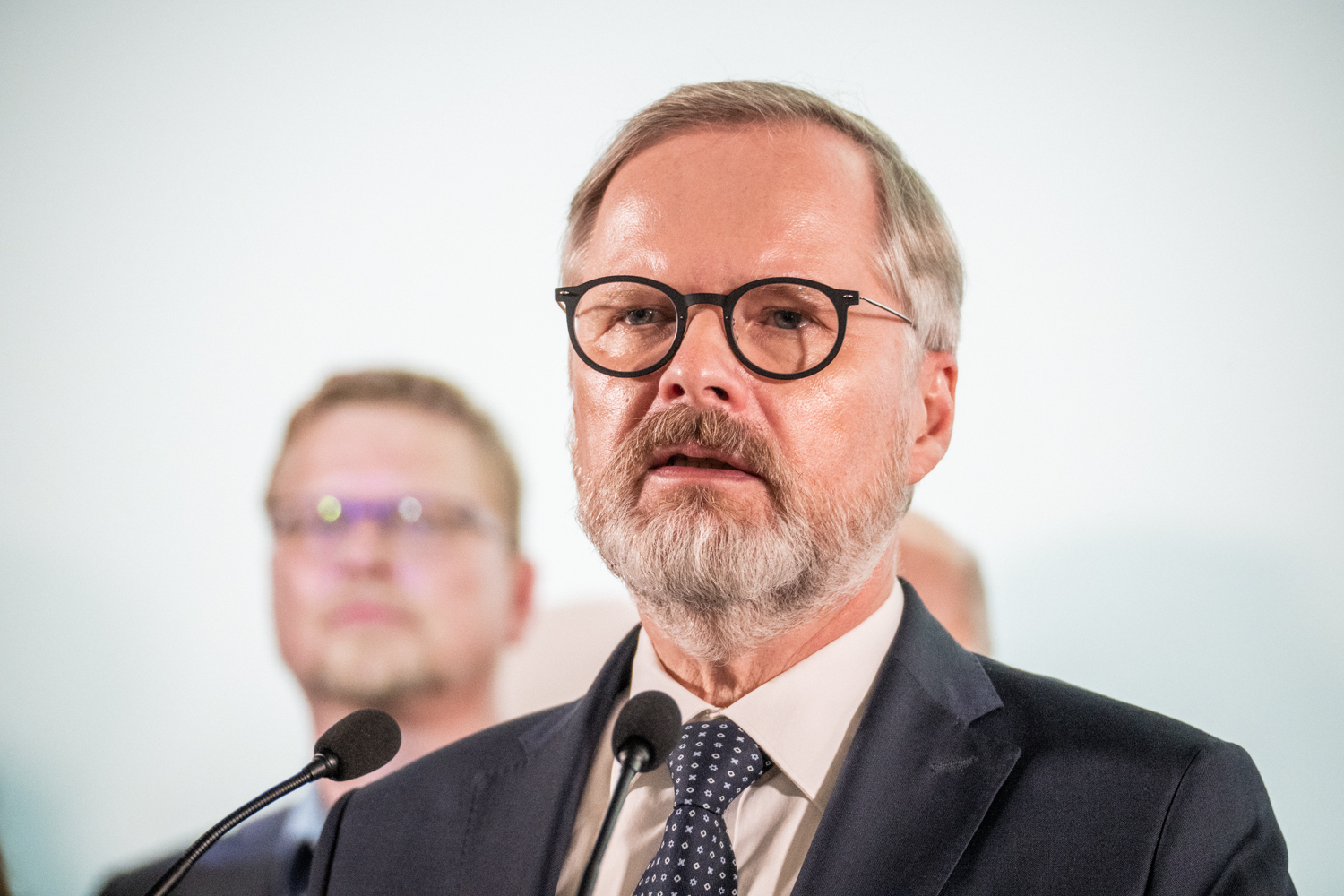 Galerie | FOTO: Lídři koalice Spolu se ve štábu jen mihli. Po tiskové konferenci odjeli