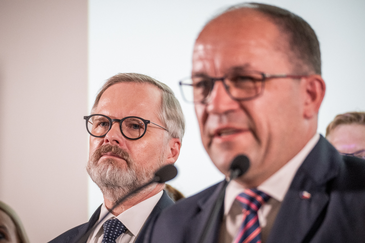 Galerie | FOTO: Lídři koalice Spolu se ve štábu jen mihli. Po tiskové konferenci odjeli