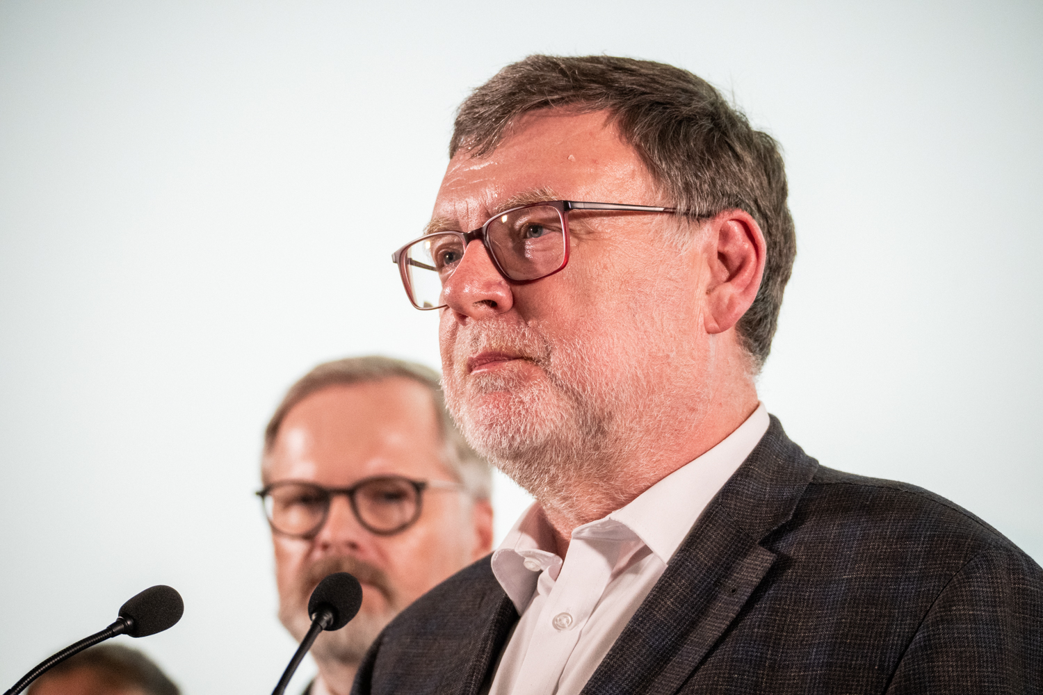 Galerie | FOTO: Lídři koalice Spolu se ve štábu jen mihli. Po tiskové konferenci odjeli