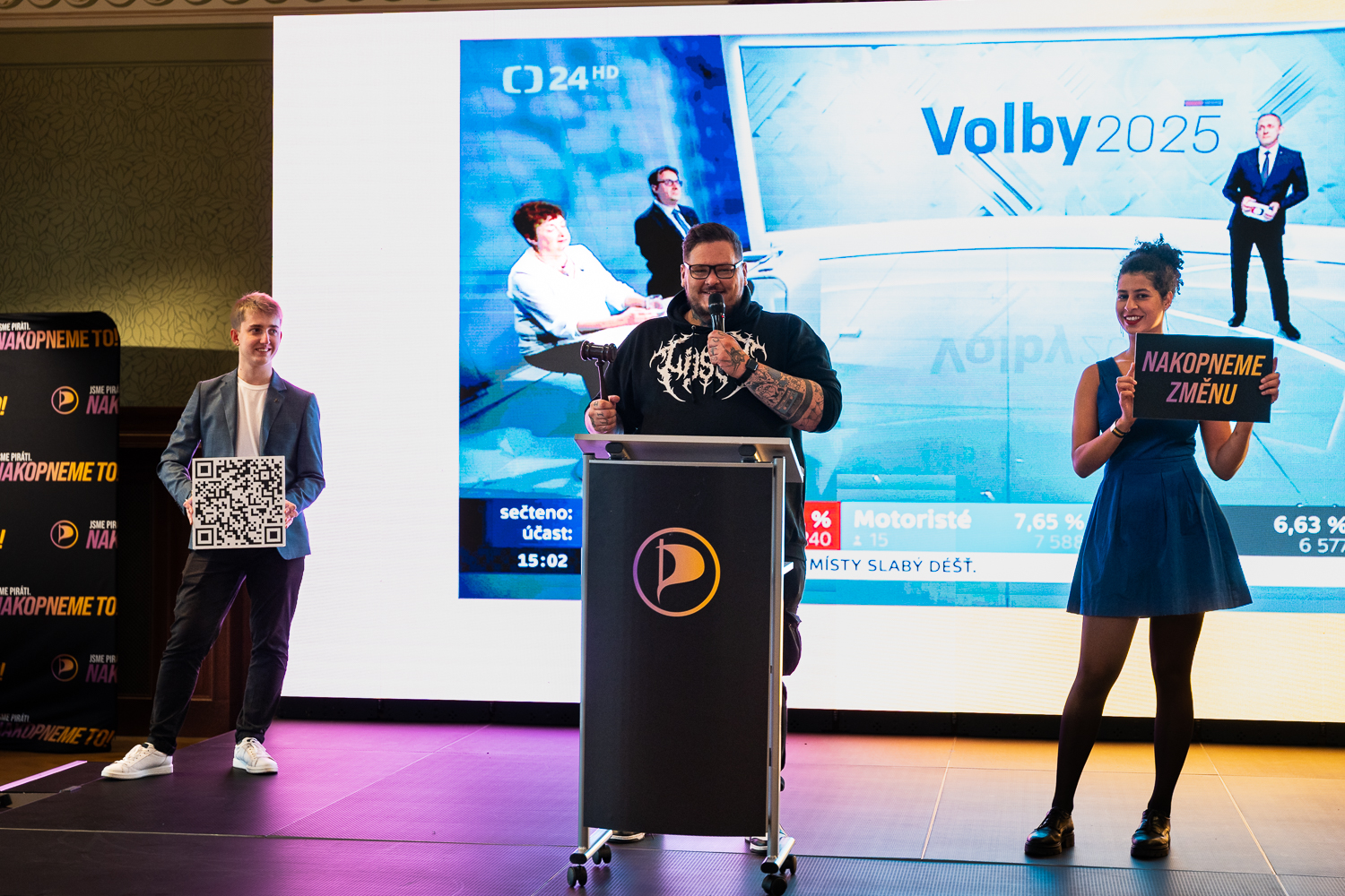 Galerie | FOTO: Piráti slaví. Hřib vidí úspěch v porážce SPD, vládní spolupráci s ANO odmítá