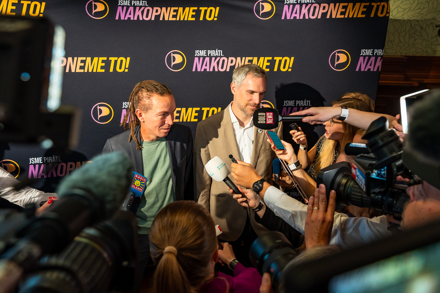 Galerie | FOTO: Piráti slaví. Hřib vidí úspěch v porážce SPD, vládní spolupráci s ANO odmítá