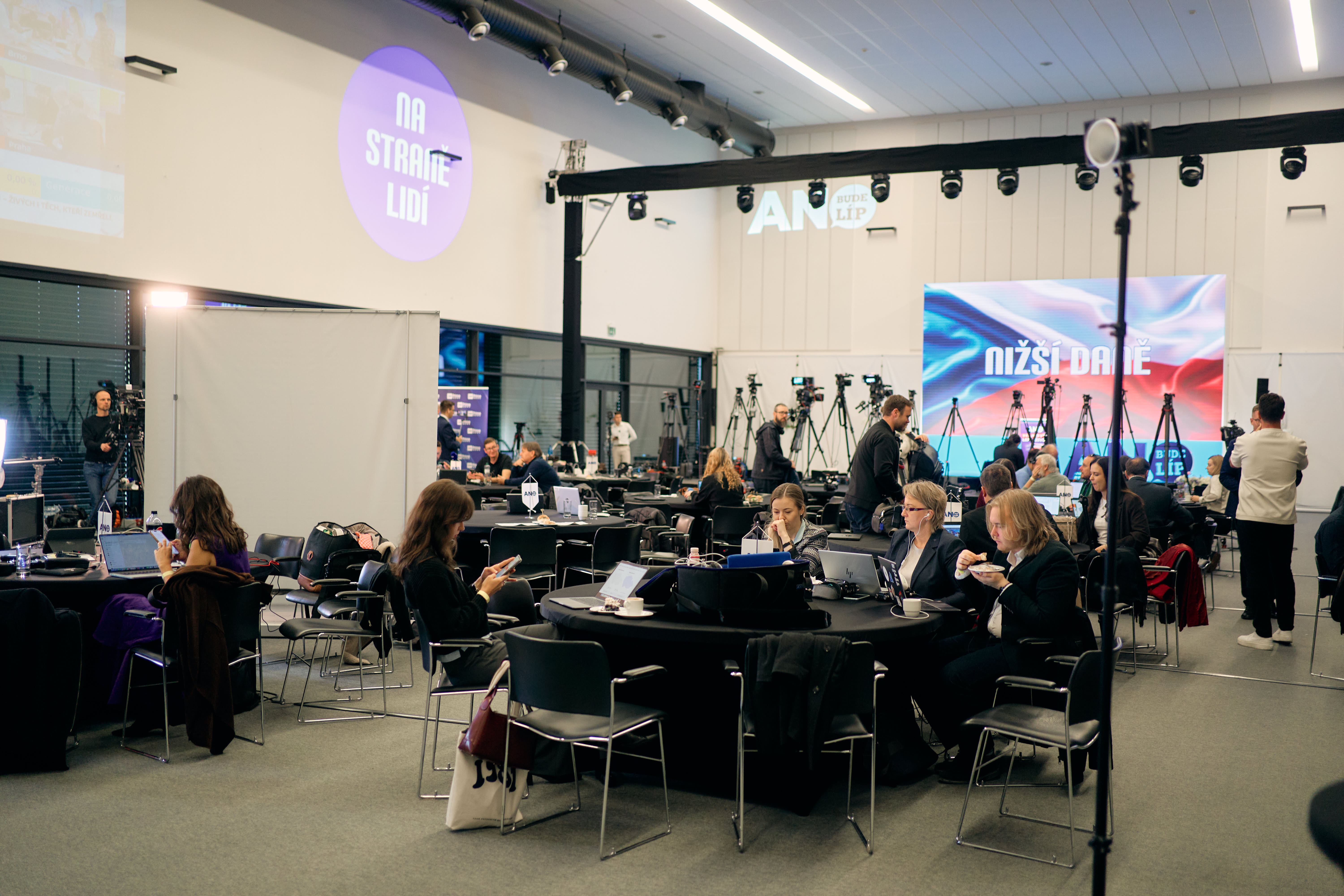 Galerie | FOTO: Ve štábu hnutí ANO se na politiky zatím čeká. Atmosféra je pozitivní